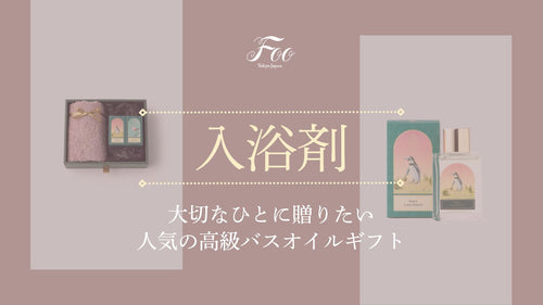 Foo Tokyoのバスオイルはギフトとしても人気。単品はもちろん、オーガニックコットンのタオルとのセットがギフトとしてよく選ばれています。