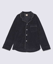 一見ベーシックなスタイルですが、トップスのシャープな襟や光沢感のある生地で、外着のシャツのようなビジュアルのパジャマです。