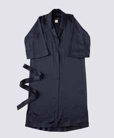「闇を美しく纏う」をコンセプトに造り上げた至極のリラックスウェアです。陽があたる場所に必ず落ちる影は、夜の訪れとともに闇に溶けて見えなくなります。その儚い美しさを極上のシルクで表現しました。