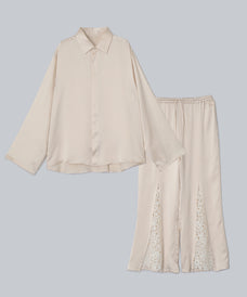 【セットアップ】ロングカフス シルクシャツ&ストレートシルクパンツ カーキ